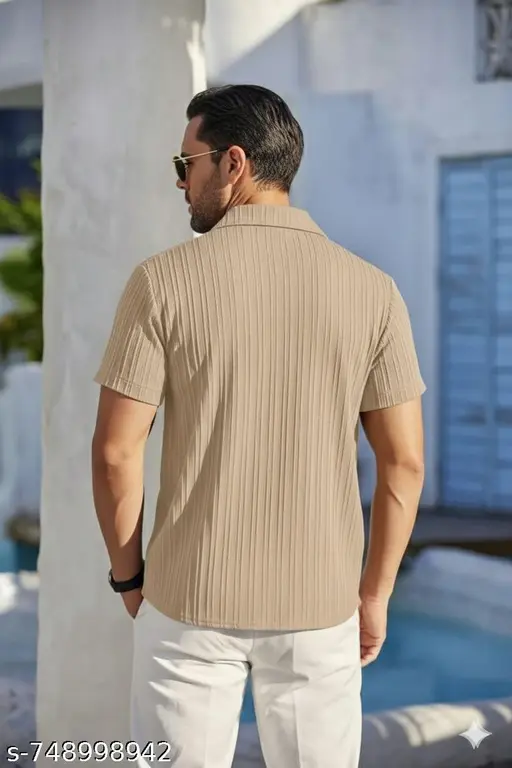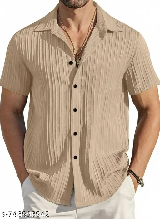 Menβs Chiku Beige Popcorn Textured Casual Shirt | Korean Style Half Sleeve Smart Summer Casual Wear Shirt for Men
